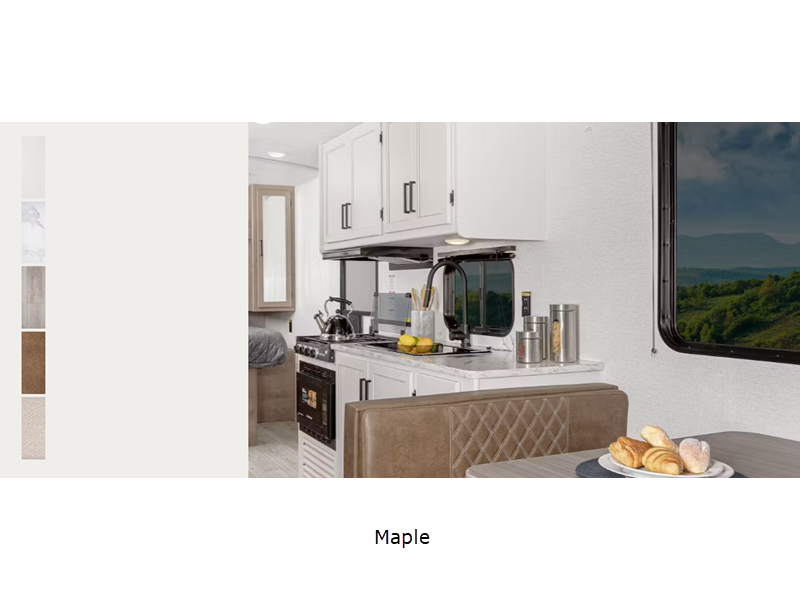 Sleeps 4 Slides 1 Length 26 ft 2 in Ext Height 11 ft 1 in Interior Color Maple Hitch Weight 620 lbs Dry Weight 5305 lbs Cargo Capacity 2195 lbs Fresh Water Capacity 45 gals Grey Water Capacity 39 gals Black Water Capacity 39 gals Tire Size ST205/75R14D Furnace BTU 30000 btu Available Beds Queen Refrigerator Type 12V Refrigerator Size 10 cu ft Cooktop Burners 3 Number of Awnings 1 LP Tank Capacity 40 lbs Water Heater Type Tankless AC BTU 15500 btu Awning Info 16' Power Axle Count 2 Number of LP Tanks 2 Shower Type Standard Similar Floorplans