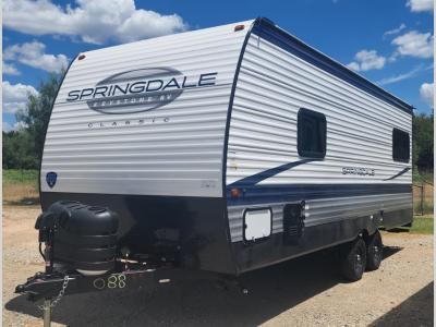 The Springdale Classic travel trailers by Keystone will provide you and your family many great outdoor experiences and it will also be kind to your pocketbook. Each one is constructed with a walkable roof and an I-beam frame with stamped steel cross-members and outriggers for added strength. There are also heavy-duty stabilizer jacks and power tongue jacks outside, along with an XL entry assist handle for added convenience. Each travel trailer includes LED lighting, bedside outlets, and blackout night shades inside that will provide you with more privacy at night.